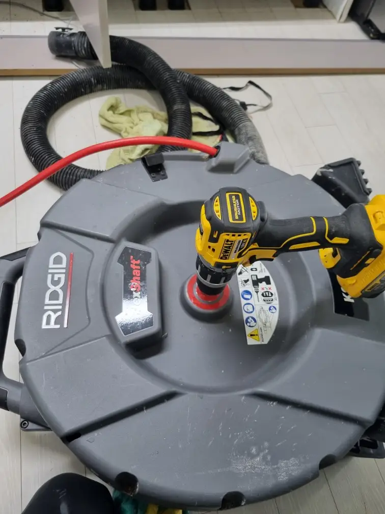 RIDGID 장비에 디월트 무선 드릴을 연결하고, 케이블을 배수구 깊숙이 천천히 밀어 넣었습니다. 약 3m 지점에서 단단한 저항이 느껴졌고, 이는 기름과 음식물 찌꺼기가 뭉친 차단층으로 추정됐습니다. 드릴의 토크를 적절히 조절하며 회전시키자 케이블이 이물질을 부드럽게 풀어주기 시작했고, 몇 분 뒤 배수구에서 거품 섞인 물이 흘러나오면서 막힘이 풀렸다는 걸 확인했습니다.